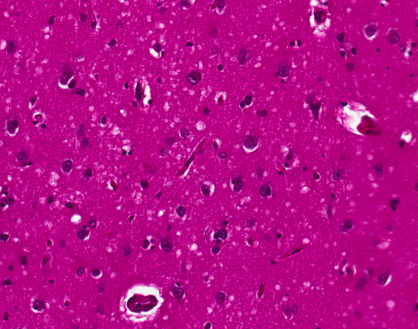 当朊蛋白错误折叠成为朊病毒后,此时的它就会获得一个类似 丧尸 的能力,即:把所有碰到的正常朊蛋白都 转换 成朊病毒。普通的朊蛋白一旦成为朊病毒后,就和丧尸一样,会获得极强的抗性,它不仅仅难以被分解,甚至还会“堵住”负责分解错误蛋白质的机理,致使细胞最终被这些“垃圾”逼疯,然后死亡。而这些朊病毒此时就会和正常的病毒一样,从细胞支离破碎的尸体里爆发出来去感染周围其他的细胞,来重复这一过程。而当越来越多的神经元死亡时,它们曾经的位置就会成为患者大脑内的一个个彰显着疾病的“ 空洞 ”,就如同死后风干的海绵上一个个任由水流通过的小孔一样。这个时候,大脑的“海绵化”就完成了,无力回天的 海绵状脑病 (spongiform encephalopathy)。