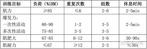(5)训练负荷、重复次数和组数及组间休息时间: