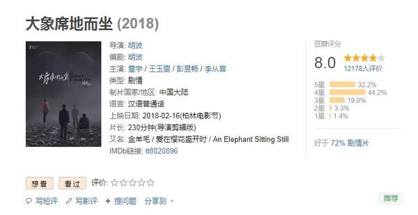 一个用生命进行创作的人他独特的魅力一定可以在举手投足中溢出来,然后被敏感的人捕捉到。当然,这种被认可、被放大也加速了胡波导演的艺术生涯,在2017年10月12号,他在北京自己的出租房里上吊自杀,年仅29岁, 而这部电影《大象席地而坐》,就是他最后的与世界交流的方式。