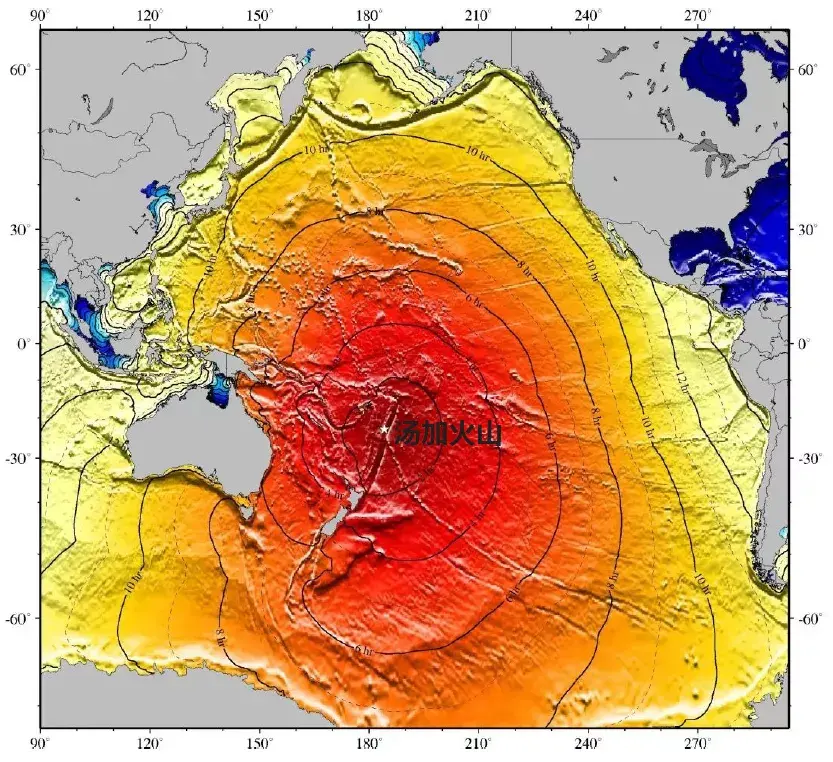 图7 汤加火山爆发引发海啸影响区域和到时图(图片来源:自然资源部海啸预警中心)