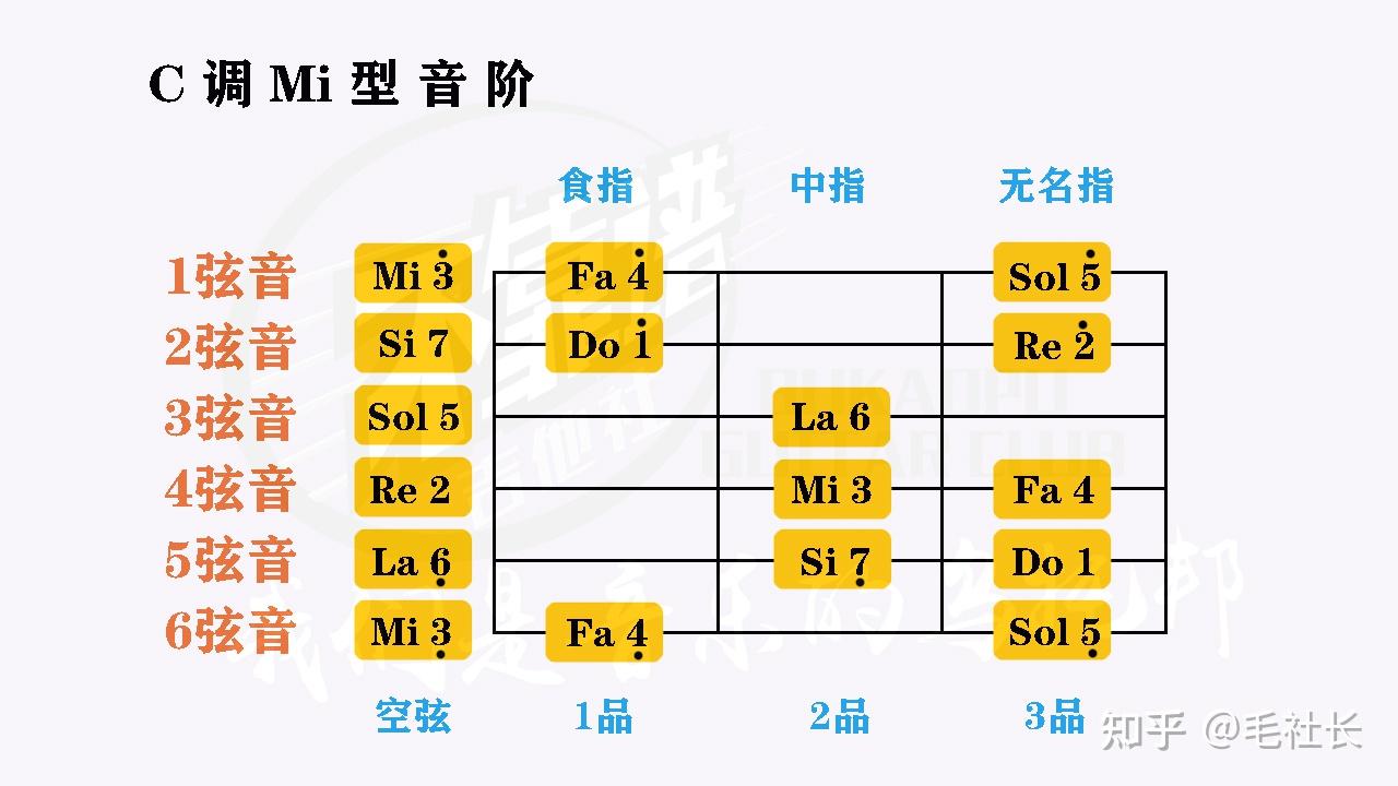 所谓mi型音阶,就是起始音为“mi”的音阶,C调mi型音阶就是从6弦空弦的“mi”音开始。如下图所示