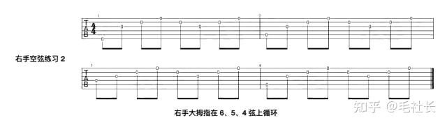 这条练习1有一个变体,就是我们让大拇指在4弦、5弦、6弦之前循环弹奏,就变为下图练习2