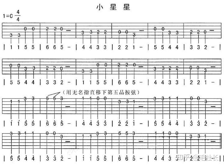 记住,我们不需要上面的6线谱,它是阻碍你快速进步东西。只看下面的简谱,对应着mi型音阶找到12345,每一个音符的位置然后弹出来。上面两行是在中音区演奏的,后面两行是高音旋律,高八度的,有一个高音的6,这个音阶是没有这个音的,用无名指移到1弦第5品来弹,然后再把无名指移到第3品弹高音5。
