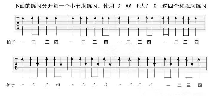 对于这个练习,我们还是应该从简单的音符节奏来练起,有时的节奏扫弦虽然简单但我们还是应该多练,练到非常熟练才行,记得要边打拍边练习才行的,如果你对节奏把握不稳定时快时慢的话当然也可以选择用节拍器开着来一起来练了,