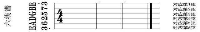 从图的上往下看表示对应吉他上的一至六线。左边为对应琴弦的音名EADGBE。和唱名362573 mi la re sol xi mi 。