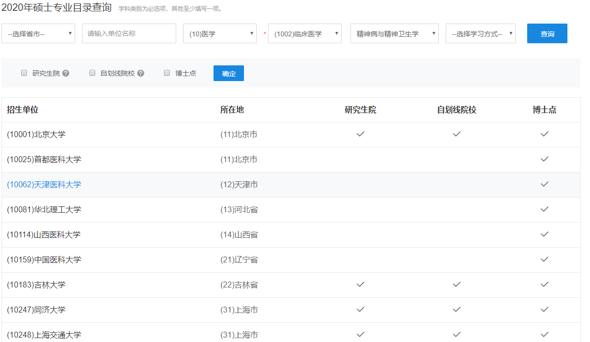 首先我认为选择学校的标准主要有三个:第一,学校精神病与精神卫生学专业的实力如何;第二,学校的综合实力与名气;第三,学校所处的地理位置。