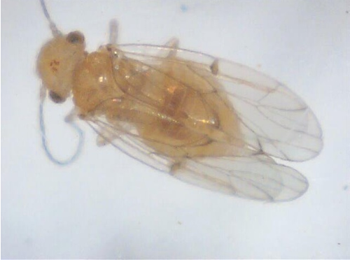 成虫体长1.5~2mm,菱形,淡黄白色。