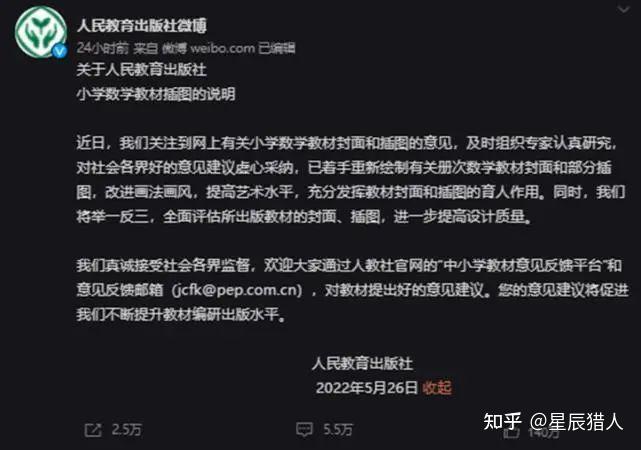 相关部门已介入26日中午,人民教育出版社发布微博回应此事,称已着手重新绘制相关插图。