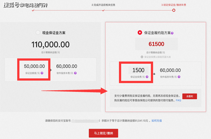 比如,之前需缴纳保证金5万的天猫店铺,商家可以选择缴纳5万的现金保证金,现金保证金不开店可以退还;也可以选择缴纳保证金履约险,保费额度=店铺应缴纳现金保证金额度*3%,也就是缴纳一年1500元的保险费。