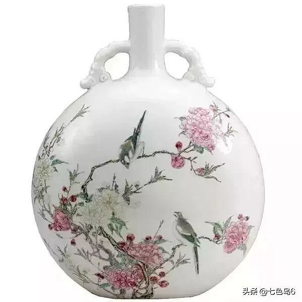清雍正(公元1723-35年),江西省景德镇瓷。粉彩花鸟纹卷云耳抱月瓶是当时粉彩瓷的精品。此壶绘画装饰的细节十分出色,反应出这件瓷器属于宫廷供用和督造制品。