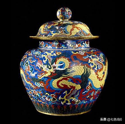 景泰蓝龙纹大盖罐,明代宣德(1426-35年)制,高62厘米。此罐装饰有威武的云龙纹图案,底部饰有莲瓣纹,罐上的文字表明这件器皿是在“御用监”的督办和资助下完成的。此罐只有一对(另一只现藏于瑞士苏黎世的Uldry Collection)。