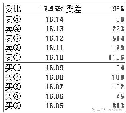 例如,图显示的是某只个股在某一时刻的买卖盘数据,在卖一16.10元处挂有1136手卖单,而在买一16.09元处的买单只有94手,而在卖二至卖五处挂的卖单也比买二至买五处的买单多,这会给散户一种卖压沉重的感觉。有卖出意向的散户担心不能成交,可能会挂出16.09元或16.08元的卖单,这时庄家就要耐心地逐步在16.09元、16.08元等多处挂小买单,等待散户的抛盘。