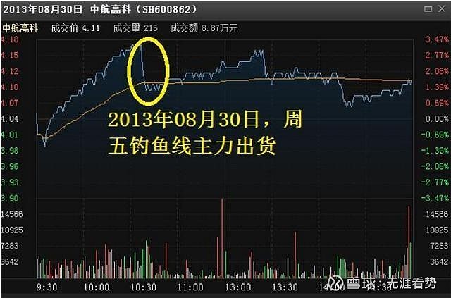 当日走势中,一开始为某一斜率上行,后突然直线大幅跳水,形成“鱼竿”及“鱼线”形。此为庄家对倒至高位且吸引跟风盘后突然降低价位抛出巨大卖单所导致。若接盘不多,庄家出不了货,可能还会回拉,反之一跌千里。