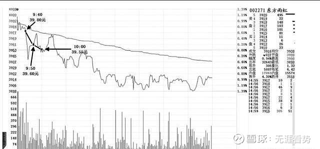 东方雨虹 9:40、9:50和10:00的股价都低于其开盘价(如图所示),当天股价收出阴线