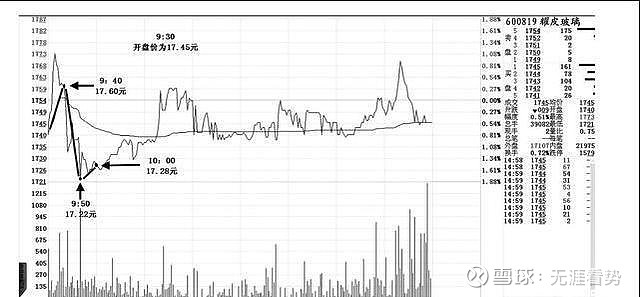 即9点40分、9点50分、10点三个移动点与原始起点(9点30点)相比,9点40分的移动点比原始起点高,而9点50分和10点两个移动点比原始起点低,这表明当天行情买卖方比较均衡,但空方比多方有力,大盘是震荡拉高出货的趋势