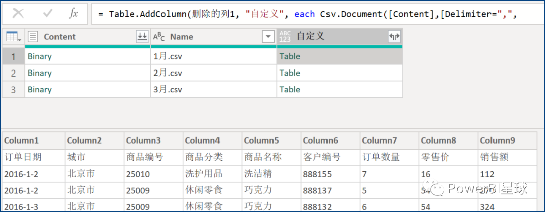 在提取Excel数据时,用的是Excel.Workbook,而对于csv文件,就不能再用这个函数了,有专门针对csv文件的函数,它就是Csv.Document,之前这篇文章也介绍过: