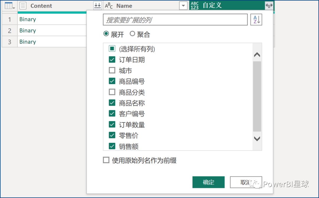 这样就将第一行用作标题了,达到了与Excel.Workbook([Content],true)同样的效果,然后再展开自定义列,选择特定的列就可以了。