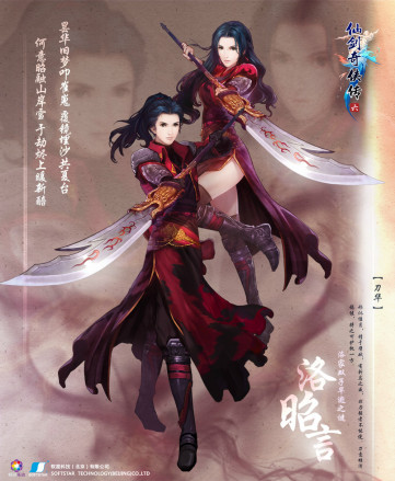 洛昭言是位女子,在游戏中以两种不同装扮的亮相,即有女扮男装的形象;双面形象从造型到动势皆为惊艳动人。她在女子装束时英气勃勃,看似犀利的眼神中透露了一丝柔情,而男子装扮时的她身穿护肩铠甲霸气十足,手中的长兵刀华逼人,令人畏惧,又显示出她侠骨坚毅的一面。