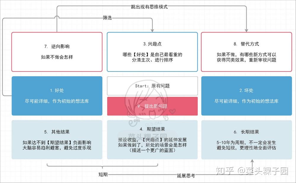 当提出问题只能有两个对立选择时,本身就会限制了解题思路。因此曼陀罗思考法正是重置问题思考角度的模型——最开始是【原有问题】,走完九宫格后提出更本质的【新问题】。