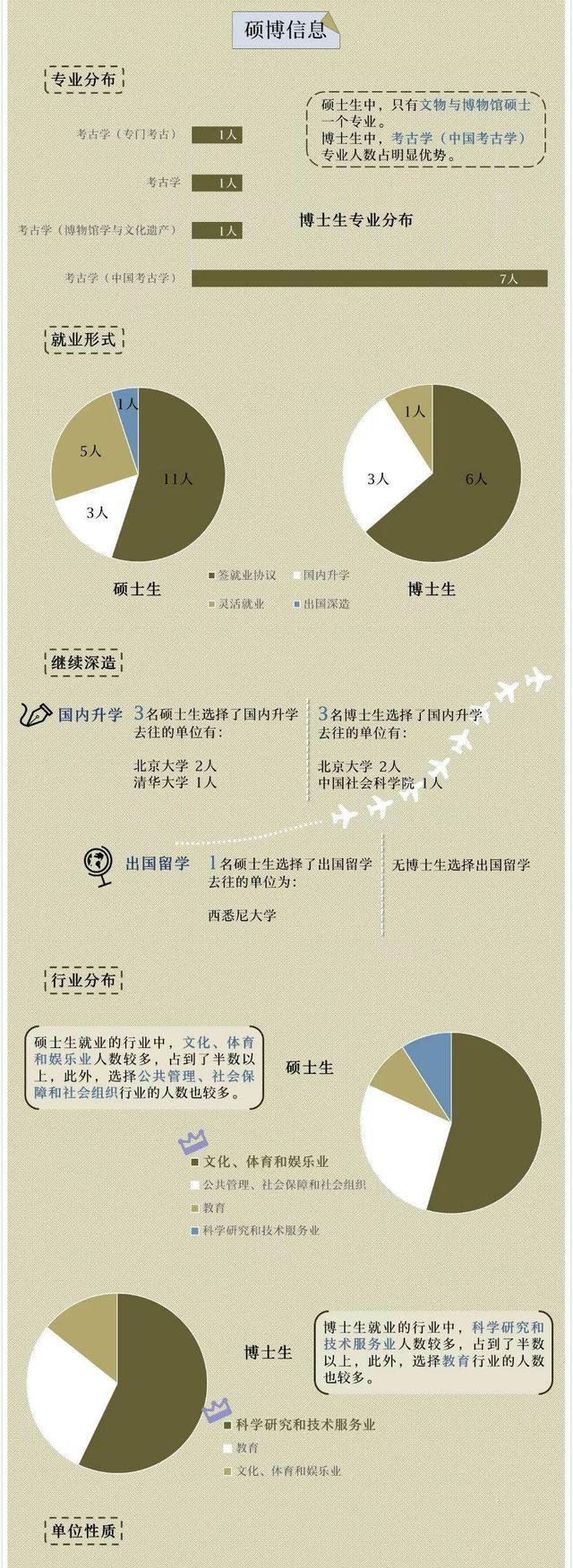 硕士和博士生以就业为主。硕士生目标单位多为国家级博物馆,如故宫博物馆、中国国国家博物馆等。博士生更倾向于选择科研单位,如四川大学等。