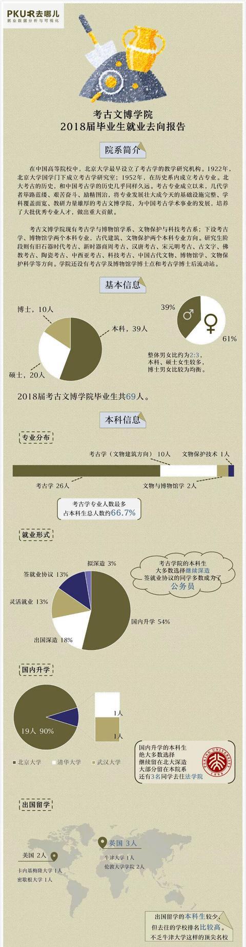 考古学专业人数最多,占到本科生总人数约2/3。本科生中近一半选择了国内升学,签署就业协议的同学多数成为了公务员。国内升学的本科生中,绝大多数选择继续留在北大深造。出国留学的本科生较少。