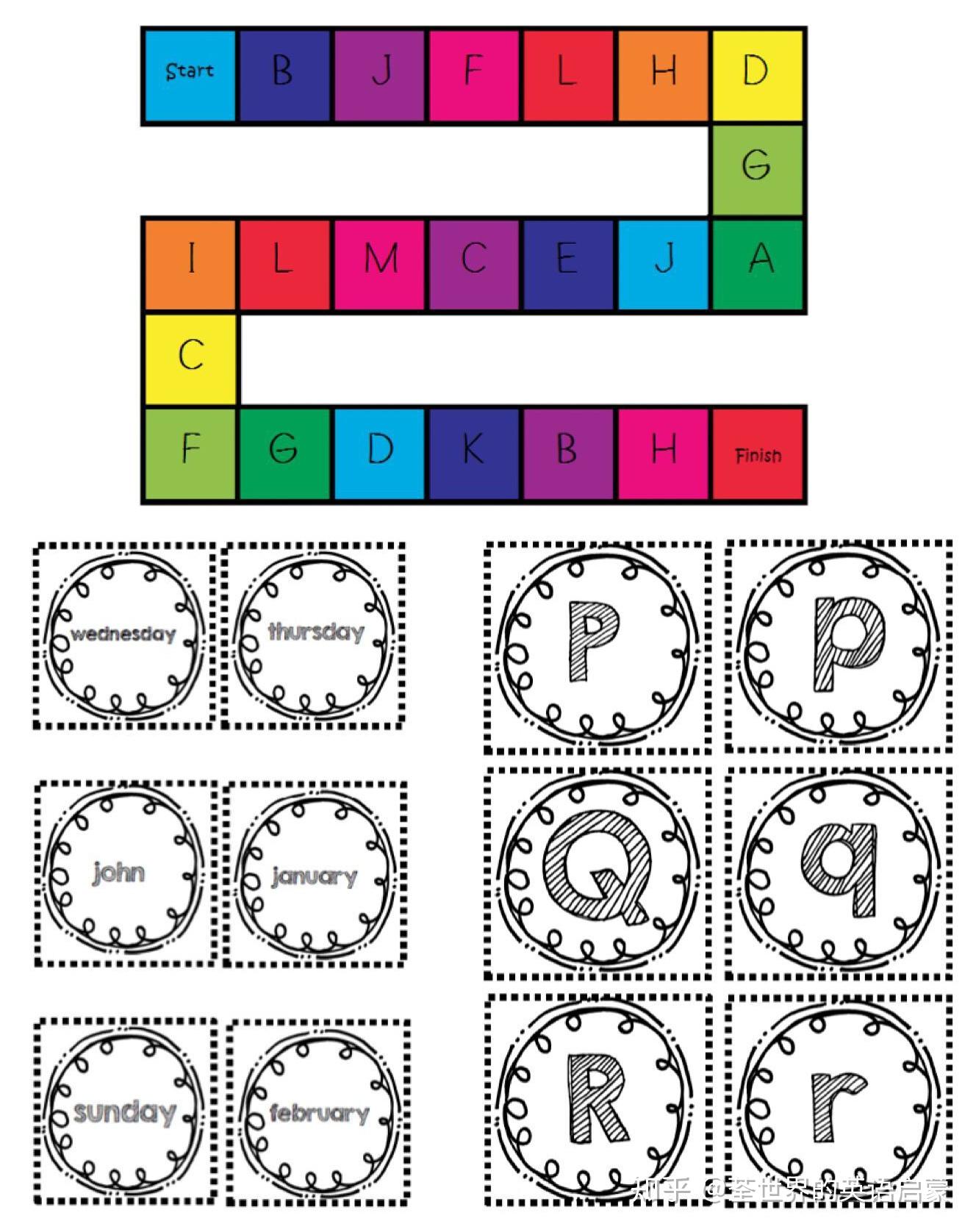 共有十几种可以打印出来的游戏,有棋盘,有卡片式的,有考眼力的,还有稍复杂一点,像桌游的玩法,其中很多我们家都玩过。以下是部分截图,怎样在玩中学,如果让孩子坐在那,你说他听,大部分孩子都坐不住,但是如果是坐在一起玩游戏,可以说只要家长引导的好效果会特别棒。 非常推荐!