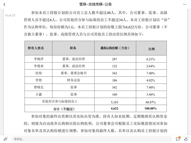 在最近的一份光线员工持股计划书中,此次光线总共拿出4622万股,分给40名员工,其中高管不多于6人,持股共占总持股股份的31.13%。也就是说,其余的34人,要分剩下的3183万股,平均每人拿到93万股左右。