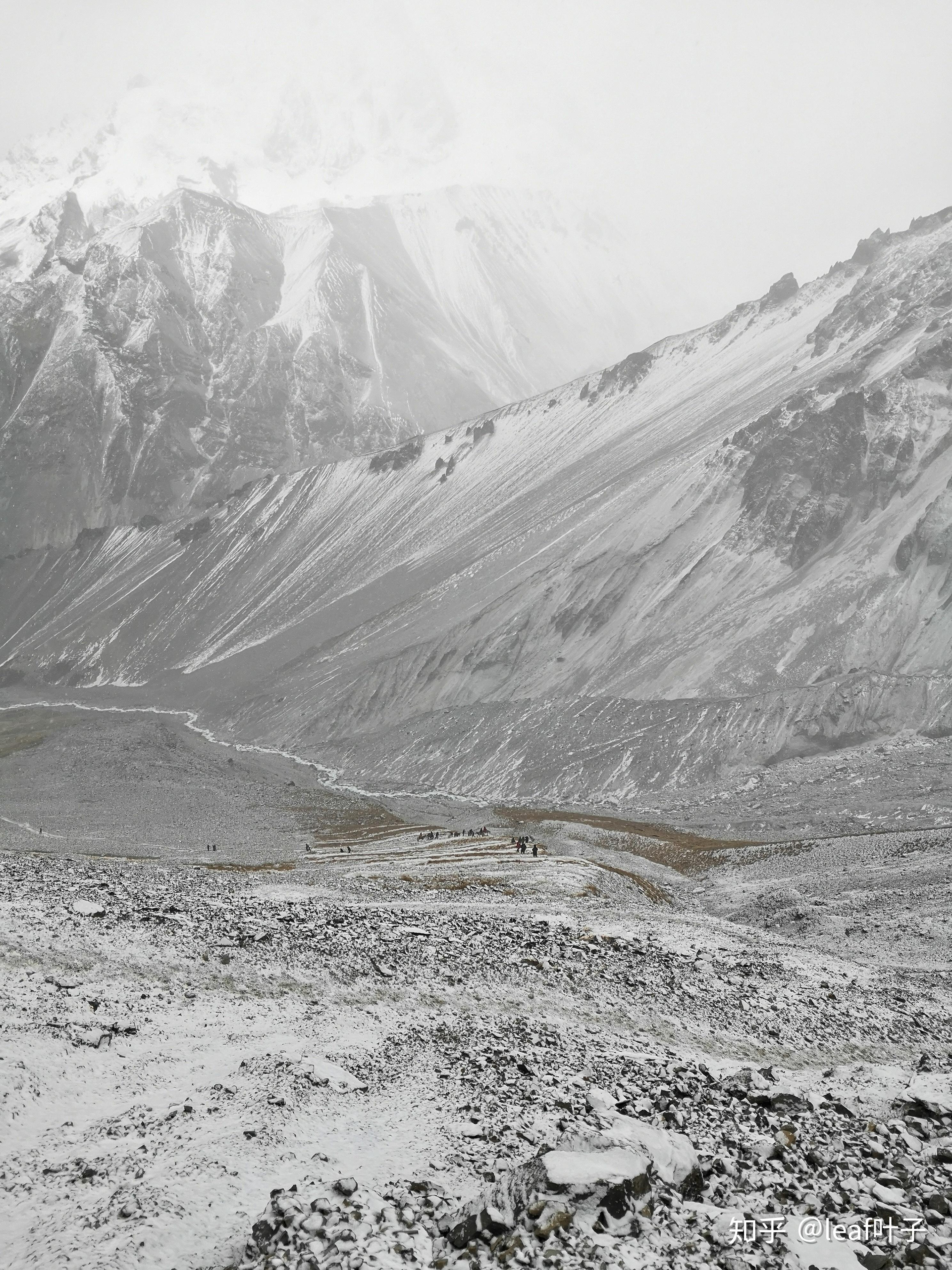我们是在11月中旬左右到达的提里丘湖,这里正在经历着一场风雪,脚踩在发出咯吱咯吱的声响,看这个积雪的厚度,应该是之前就已经有一部分的积雪掩盖了道路。沿途狂风肆虐,雪花凝结成粒在风速的加持下拍打在脸颊。风雪和浓雾隐藏了应有的美丽风景,拍摄几张照片后我们就原路下撤了,下撤的途中风雪渐渐小了下来,手指也可以随意的伸展。下撤的速度比爬升时候要快很多。