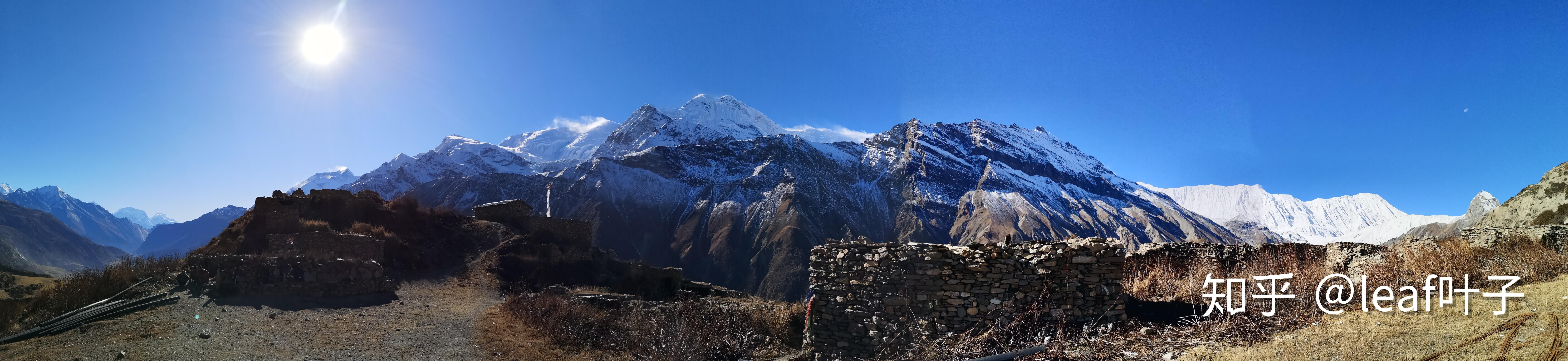 站在山坡上,从左到右分别是Annapurna II(7937m)、Annapurna IV(7525m)、Annapurna III(7555m)、Gangapurna(7545m)、Tilicho Peak(7134m)依次排开,非常之壮观。