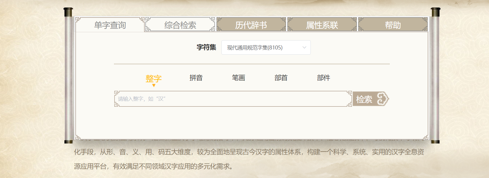 汉字全息资源应用系统是北师大的汉字研究与现代应用实验室所研发的一个古文字检索系统,是王立军教授团队的一个数字化项目成果,按其官网介绍来说,“汉字全息资源应用系统”是在新型汉字学理论的指导下,充分运用当前的数据库技术、信息挖掘技术、可视化技术等现代化手段,从形、音、义、用、码五大维度,较为全面地呈现古今汉字的属性体系,构建一个科学、系统、实用的汉字全息资源应用平台,有效满足不同领域汉字应用的多元化需求。就其实用功能来讲,对于古文字认知有一定兴趣的同好以及学习《古文字学》这门课程的本科生来说已经够用了,但对于从事古文字学术研究的学者来说,这一数字人文系统是远远不够用的,内容还较为欠缺。
