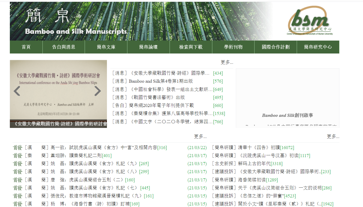 简帛网是由武汉大学简帛研究中心创建,该中心的主要学术方向是:①以戰國文字為主的古文字研究;②以簡帛為主的戰國秦漢出土文獻整理與研究;③以簡帛文獻為主要著眼點的先秦、秦漢史研究。④新技術在簡帛文獻解讀中的應用。对于研究简帛的学者而言,简帛网的简帛文库中所收录的论文绝对是非常好的参考,其中的简帛论坛模块也可以为相关研究提供思路启发,其中的简帛字形、辞例检索数据库涵盖内容也非常全面,对于相关研究者而言,极力推荐。