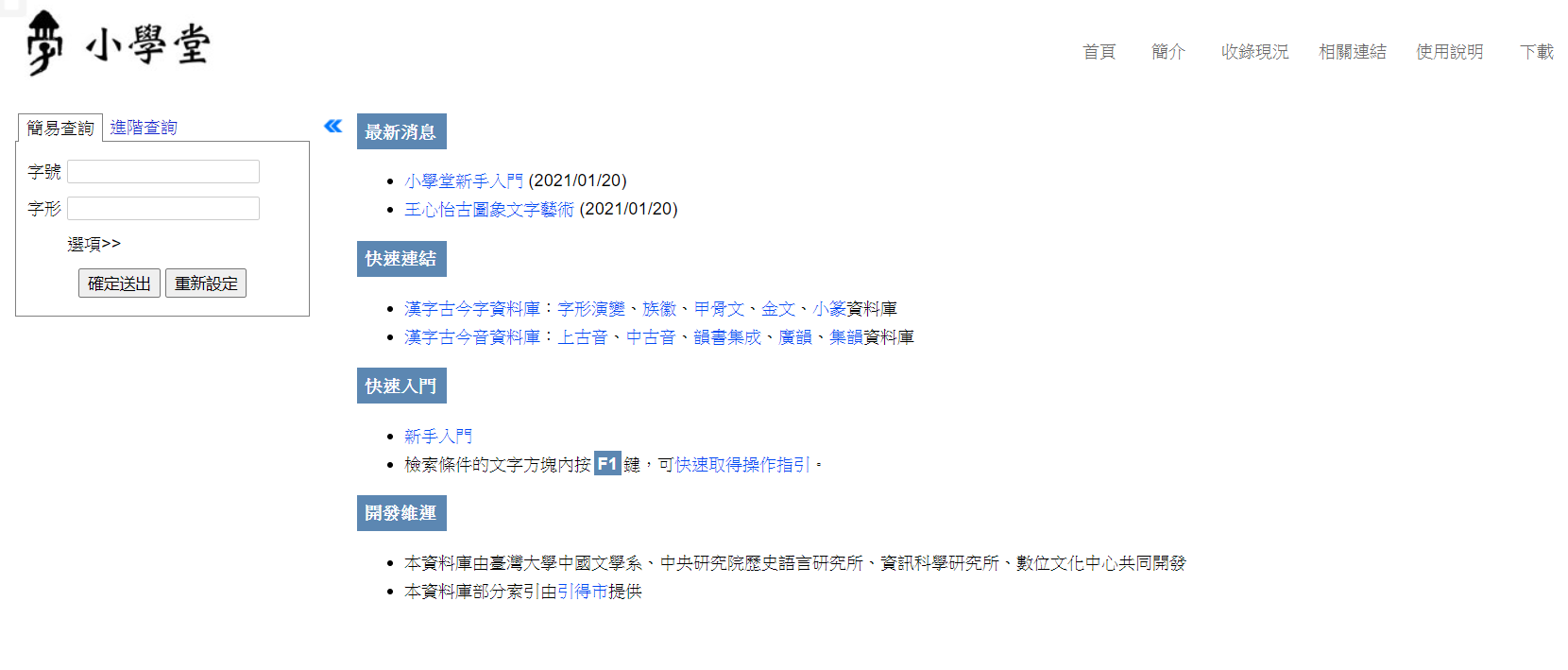 「小学堂文字学数据库」是一个形、音、义综合的文字学数据库,可提供用户根据文字的形、音等属性先检索出字头,再透过字头连接到个别的形、音、义数据库或字书索引。