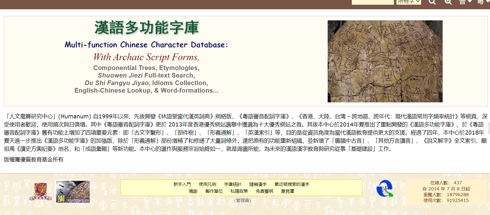 汉语多功能字库是香港中文大学人文电算研究中心的项目成果,在《粤语审音配词字库》旧有功能上增加了四项重要元素:即「古文字系形」、「部件树」、「形义通解」、「英汉索引」等,并于2018年进一步完善,除于「形义通解」部份增补了和修缮了大量词条外,还把原有的功能重新组织,并新增了「广韵中古音」、「其他方言读音」、《说文解字》全文索引、顾祖禹《读史方舆纪要》地名,和「成语汇辑」等新功能。对于研究古文字、音韵学、方言学等方向的研究者来说,是一个非常好的网站。