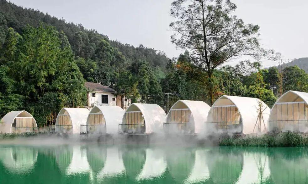 大雨村第一个打造出的林盘叫“鲜道•幸福里”,你可以在湖边的白色篷屋里品尝中餐、火锅,还可以在湖边烧烤,享受美食与美景的碰撞。餐后沏上一杯茶,在林间享受悠闲的坝坝茶时光。