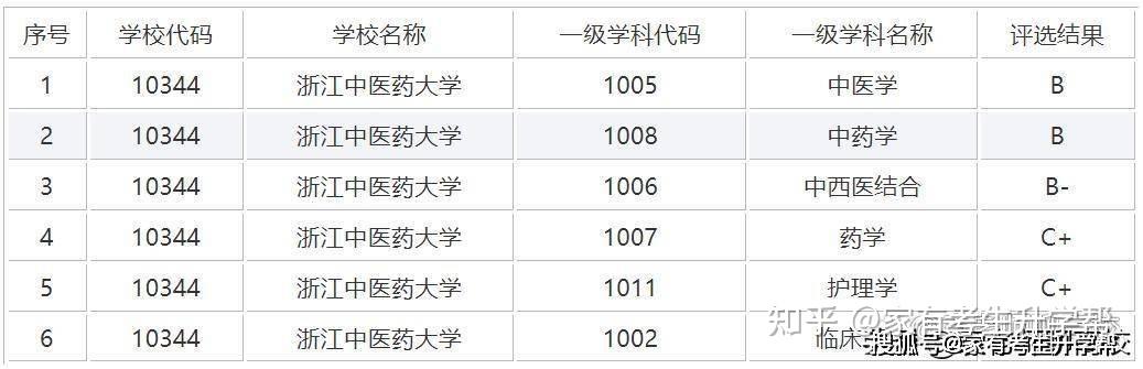 在第四轮学科评估中,浙江中医药大学有6个学科上榜,其中中医学和中药学等两个学科被评为B,中西医结合被评为B-,具体可见下图。