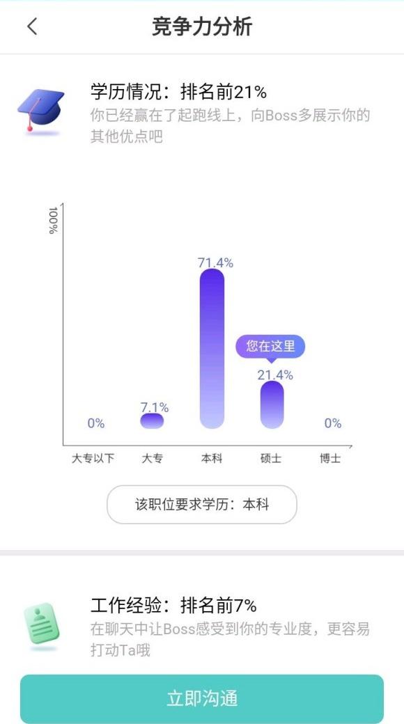 很多招聘入职成功的员工经验分享,说BOSS直聘里面竞争力分析挺有用,可以帮助求职者了解岗位竞争情况,扬长避短(与HR沟通进度;学历;是否发送简历)提高整体面试成功率。