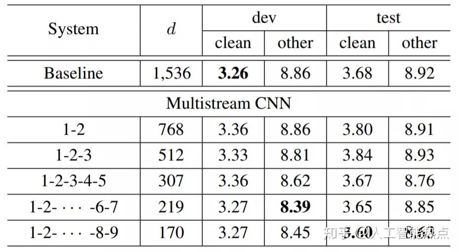从表1可以得出 分支越多,WER越低 ,模型对噪声越鲁棒。但是如果对扩张率进行调参的话,也是可以在少分支下得到一个不错的结果。