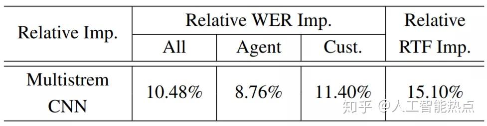 如表5所示, 客户频道记录的WER相对改善了11.4% ,说明了多流CNN架构的强大功能。此外, 相对于基线TDNN-F模型,相对实时因子(RTF)优化了15.1% ,这表明了所提出的模型体系结构的实用性,尤其是在需要在线推理的情况下。