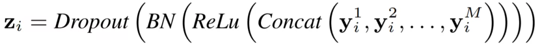 语音经过一个由多层CNN(可以是TDNN-F或者2D-CNN)组成的分支后分成多个分支,之后的每个分支也由多层TDNN-F组成,其中每个分支都有自己的扩张率。假设在时间 i ,从图中“singlestream TDNN-F”模块出来的嵌入向量为 x_{i} ,分支 m 的扩张率为 r_{m} ,那么从分支 m 出来的输出向量 y_{i}^{m} 为: