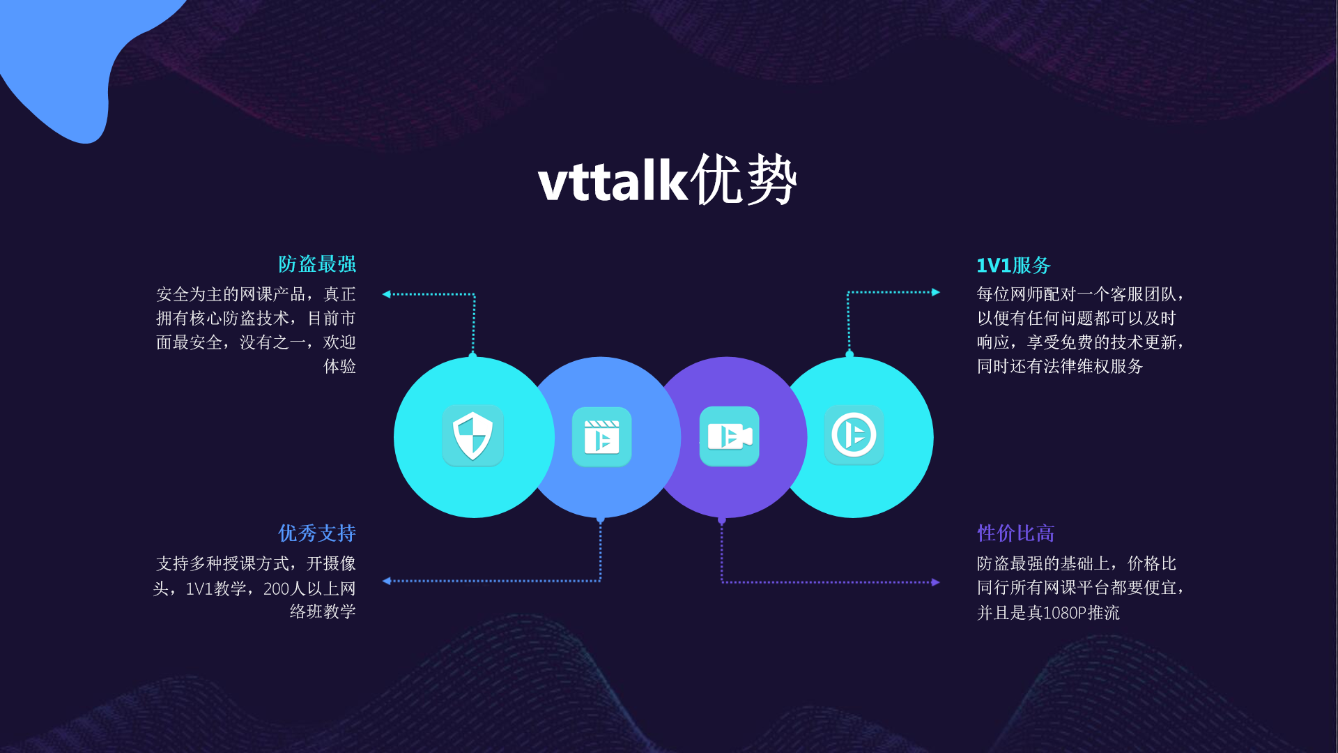 Vttalk直播平台以其专业的防录屏、防盗版技术在盗版猖獗的知识付费平台中脱颖而出,目前为入驻vttalk直播的2000多家在线教育提供了长达两年的知识产权保护动作,两年来没有发生过任何被录屏事件,没有任何盗版从这个平台流出过。Vttalk直播的防录屏、防盗版技术做到了极致,达到了防黑客攻击的程度,几乎是国内该领域的天花板,拥有三大核心防盗优势,即全网唯一能百分百防录屏检测技术、全网唯一不能被破解的原创核心视频加密算法、全网唯一不能被去除的防盗水印制作方法,经过2000多家在线教育机构实际验证、亲测有效。