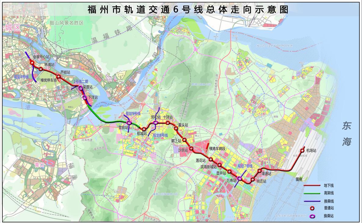福州地铁6号线的概念早已在福州地铁规划初期就已提出,最早的概念便是充当市区-长乐-机场的联络线,在后来滨海新城规划的加入,6号线的意义更是重大,直接成为了滨海新城连接老城区主干线,于是6号线也成为了第二期建设中的首个工程。6号线原起于会展中心站,自三江口、长乐老城区、滨海新城片区最后终于机场站,全长约41公里,设站20座。