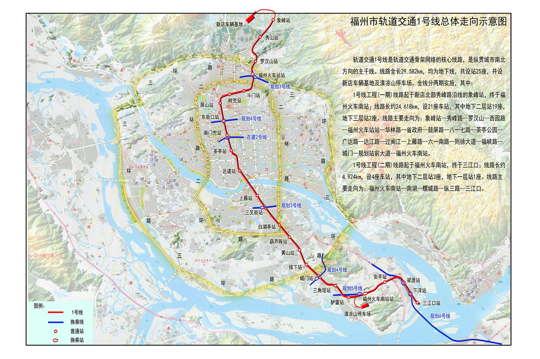 福州地铁1号线 全长约30公里,分两期建设。目前已经运营的一期贯通起了五四北、火车站、五四路CBD北端、南街与茶亭商圈、未来的三叉街商圈以及火车南站,而二期的开通将连接到三江口CBD,这样一个南北走向就已经连接起了福州好几个重要节点,规划还是相当不错的。目前来看,一号线最主要的客流集中在 象峰-三叉街 这一段,而南段因为周边还没怎么开发,因此除了火车南站尚无较大的客流点,当然现在地铁一开通,开发商就盯上了南段沿线地块了,因此目前福峡路几乎所有楼盘都打着地铁的旗号,故可以预见将来南段车站也不再像现在这样空荡了。