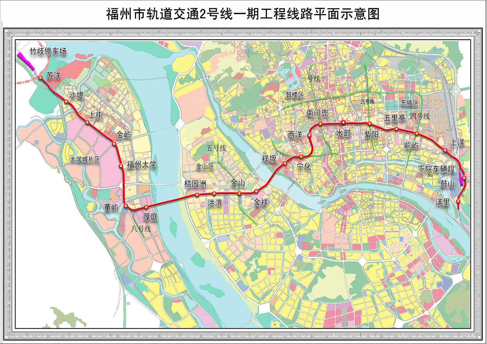 福州地铁2号线 全长约37公里,分两期建设。一期为 苏洋-洋里 ,二期为 竹歧-苏洋 ,而在此前基本规划好的 洋里-马尾港的东延线因为三期的市区-马尾-滨海线提上规划日程而取消 ,现在该线路目前有两种命名,为 7号线/10号线 ,涉及滨海的线路下面会继续讨论,二期还尚不保证会在三期建设。从一期工程来看,二号线主要连接了大学城、高新区、金山生活区、闽江北CBD、万宝与南街商圈、鼓山片区,二号线所经过的地区大多已经开发成熟,通勤需求大,通车后带来的线网客流非常可观,特别是大学城、金山、晋安往各商圈和两站方向,可以预期将会在一定程度上缓解城区交通压力。