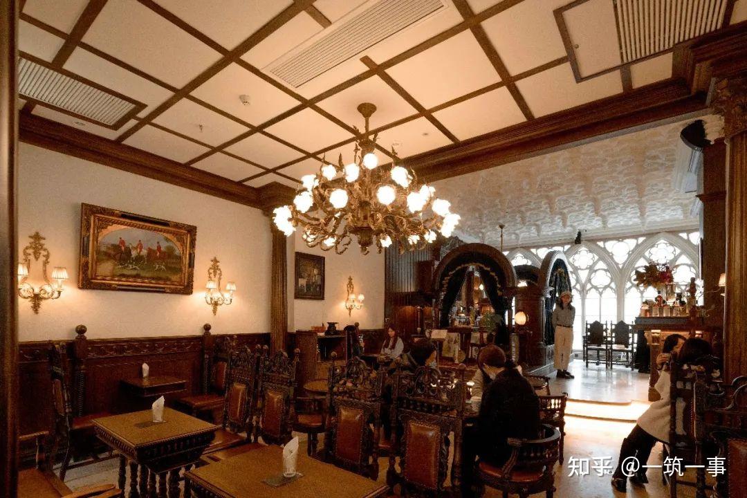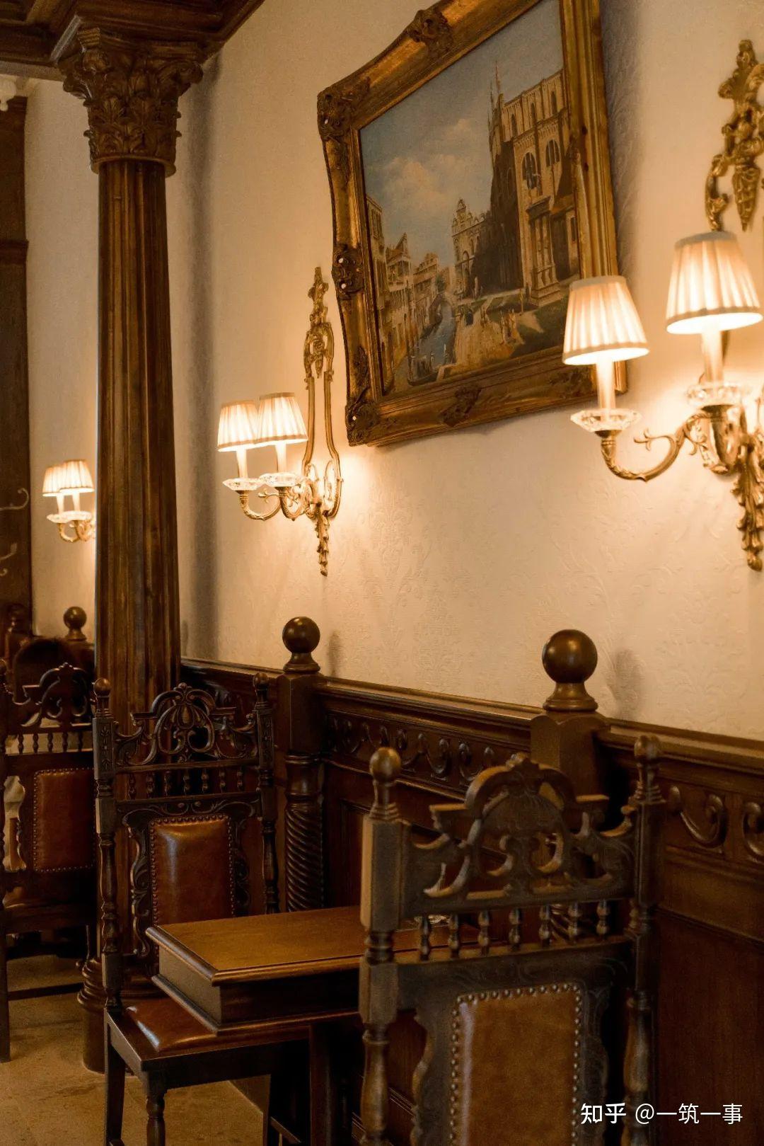 进入空间深处,仿佛回到了18世纪的欧洲,洛可可风格吊灯和壁灯、新古典主义艺术风格的油画、奢华又精美的巨大吊顶、哥特风格的彩绘玻璃和落地窗......每一处都展示着设计者的审美趣味和用心程度。