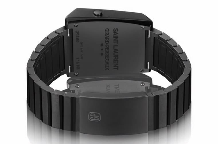 ▲表背的钛金属以PVD技术镀上黑色,并同时刻上芝柏表与圣罗兰的品牌Logo,同时手表的限量编号也刻在底盖上彰显收藏价值。