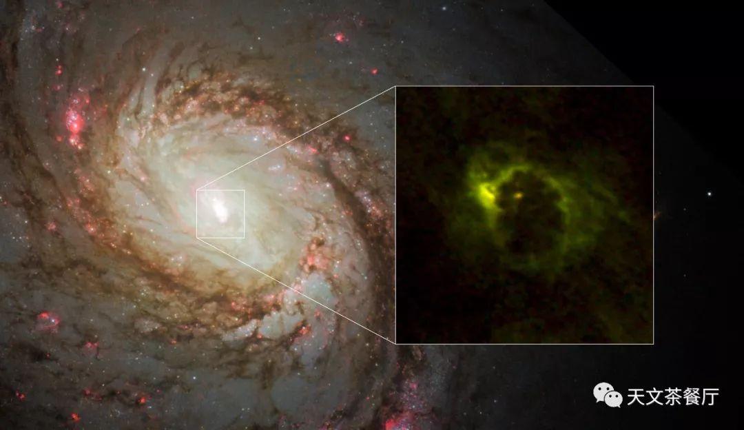 现在认为几乎所有星系的核心都隐藏着一个巨大的黑洞。研究者们很早就知道,星系的质量越大,核心黑洞的质量也越大——这听上去非常合理的。但是宿主星系的质量通常要比核心黑洞大上百亿倍,这两个在尺度上迥然不同的物体想要直接相互影响应该是十分困难的,并且,二者之间的关系将如何往下发展呢?为解决这个扑朔迷离的问题,一组天文学家利用ALMA的高分辨率观测了棒旋星系M77的核心。M77的中心区域是一个活动星系核,英文缩写为AGN(active galactic nucleus),周围的物质正在迅猛掉入核心超大质量黑洞并发出强光。活动星系核还能极大地影响周围的环境,因此他们是解决星系与黑洞共同演化之谜的关键角色。