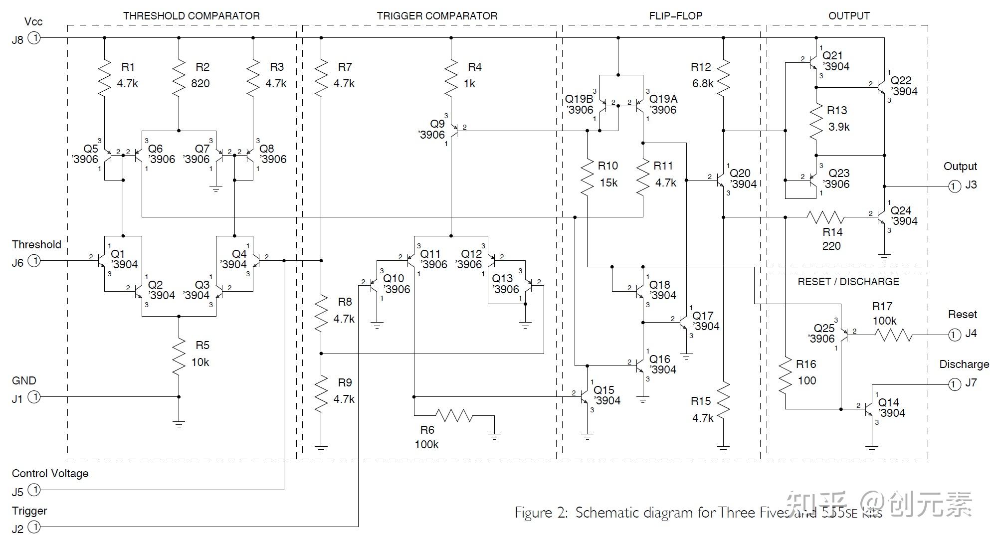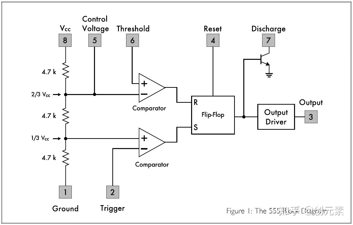 从这个角度来看,555是一个相对简单的电路,其核心是由这三个基本元素组成的。