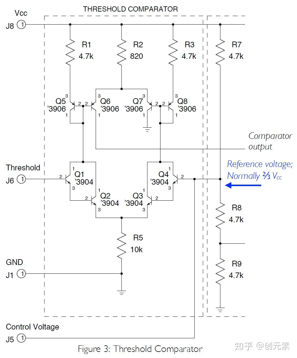 差分放大器本身的作用有点像跷跷板:当阈值输入的电压高于参考输入的电压(Vcc的⅔),电路中的电流主要来自左边的Q1和Q2。记住,电路是对称的)。当阈值电压低于参考电压时,电路改变状态,大部分电流通过Q3和Q4流动。