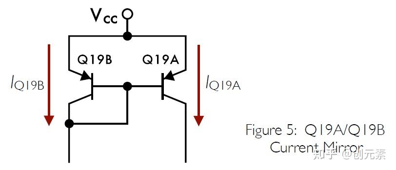 由于它们的发射极和基极是连在一起的,所以Q19A和Q19B都有相同的基极-发射极电压。对称性决定了每个晶体管的发射极到基极的电流应该相同。因此,两个晶体管允许相同数量的电流通过其集电极。如果电流IQ19B来自Q19B的集电极,同样数量的电流将流经Q19A的集电极:IQ19A = IQ19B。在这个意义上,通过Q19A的集电极的电流 "反映 "了Q19B的电流。