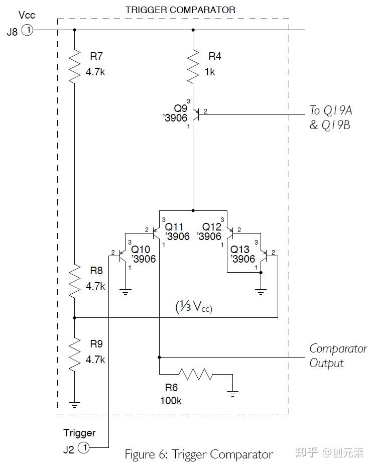 触发比较器的工作原理与阈值比较器的第一(下)部分相似,只是它是倒置的,并且使用PNP晶体管的安排略有不同。它们被颠倒的原因是为了确保共模输入电压范围一直延伸到零。这很重要,因为参考电压端来自R7、R8和R9的⅓Vcc。 差分放大器的两个输入是那个⅓Vcc参考电压和来自触发针的输入。